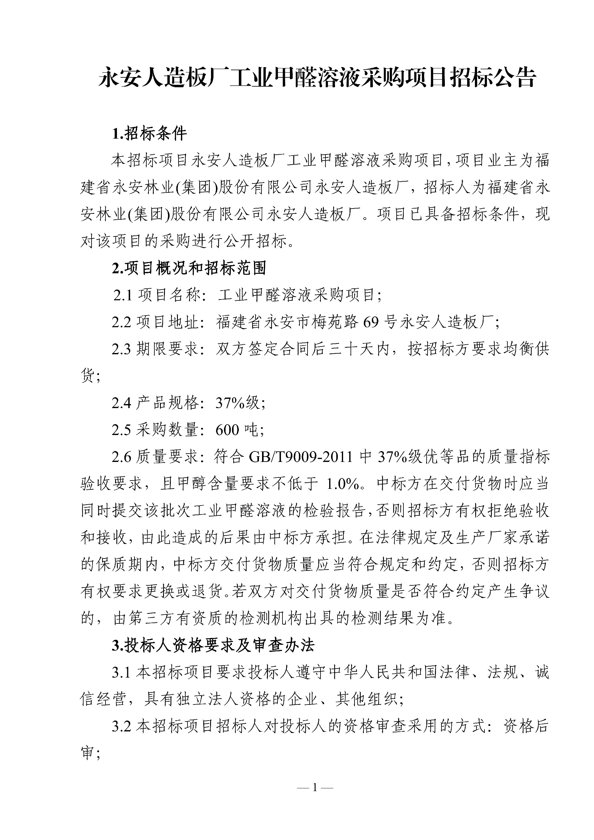 永安人造板廠工業(yè)甲醛溶液采購(gòu)項(xiàng)目招標(biāo)公告