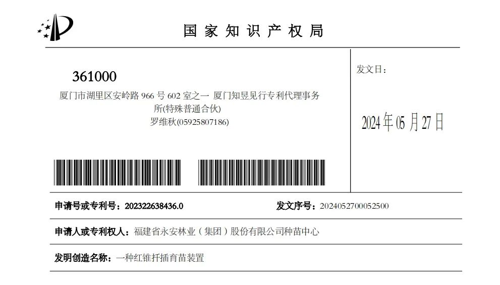 近日,永安林業(yè)所屬種苗中心《一種木莢紅豆育苗裝置》《一種紅錐扦插育苗裝置》2項(xiàng)實(shí)用新型專利獲得國家知識產(chǎn)權(quán)局授權(quán)。2項(xiàng)專利實(shí)用性強(qiáng)、應(yīng)用領(lǐng)域廣,可有效提高育苗效率和苗木質(zhì)量,為永安林業(yè)加強(qiáng)珍貴樹種培育進(jìn)一步提供技術(shù)支撐。
