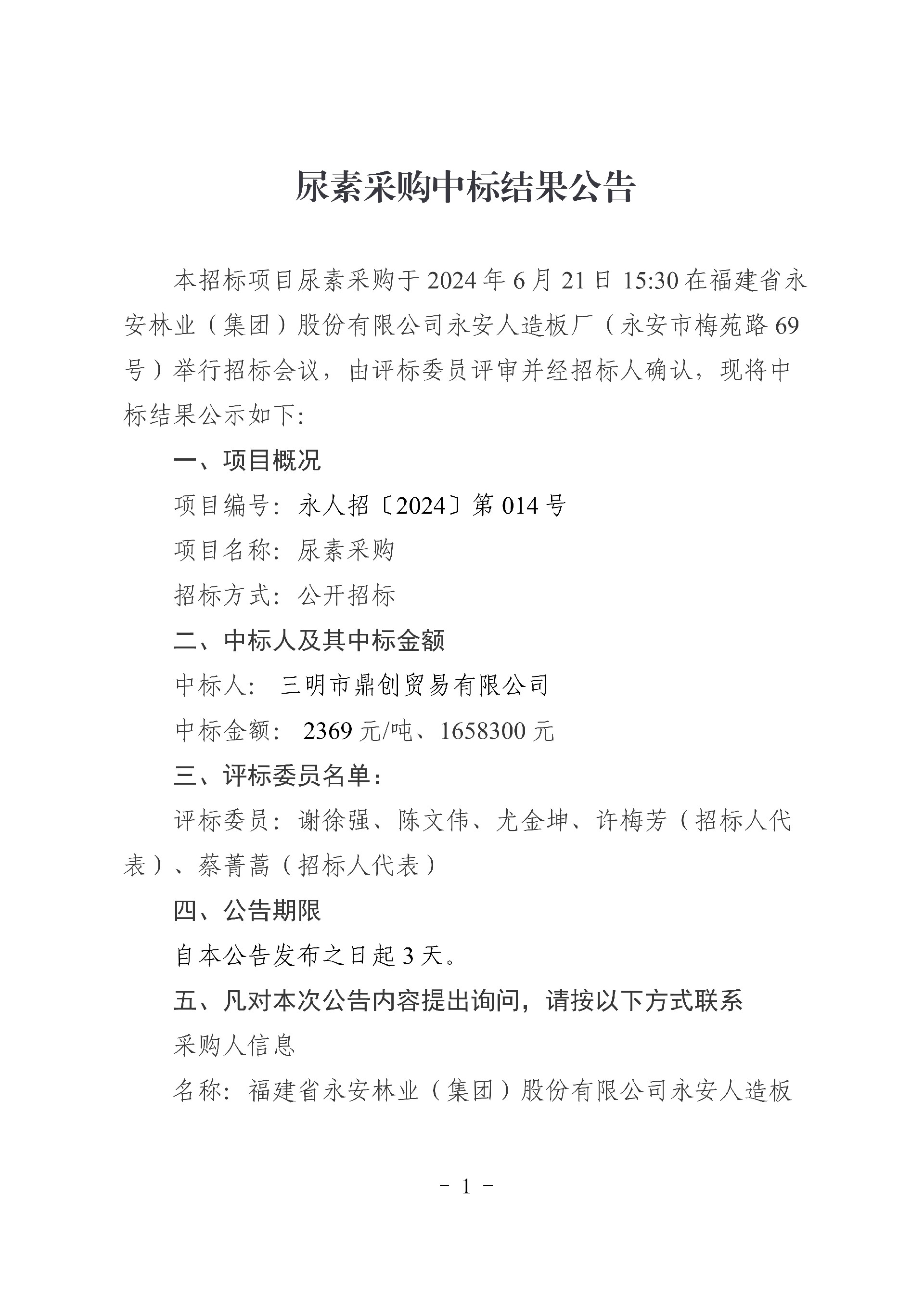 永安人造板廠尿素采購(gòu)中標(biāo)結(jié)果公告