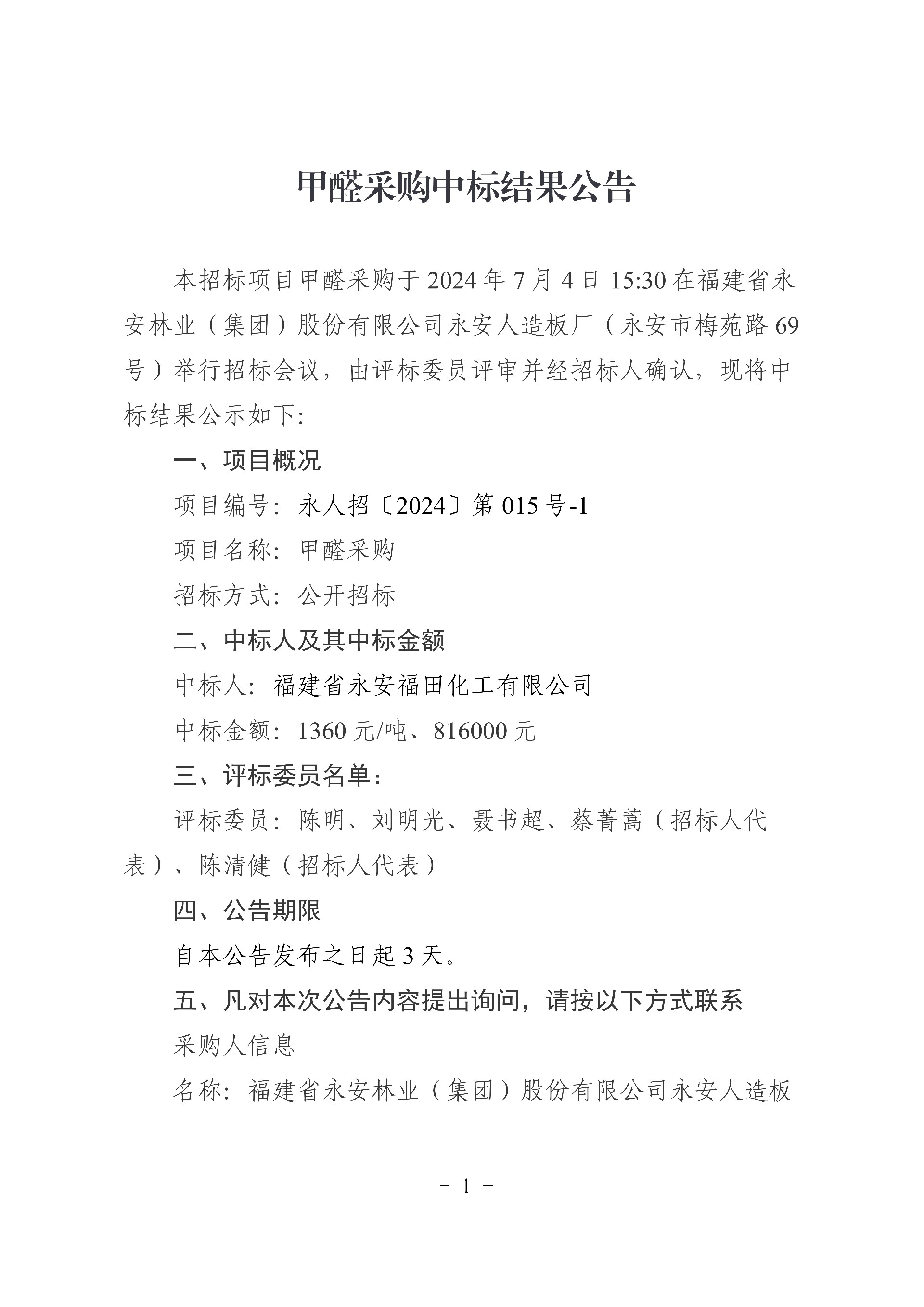永安人造板廠甲醛采購(gòu)中標(biāo)結(jié)果公告