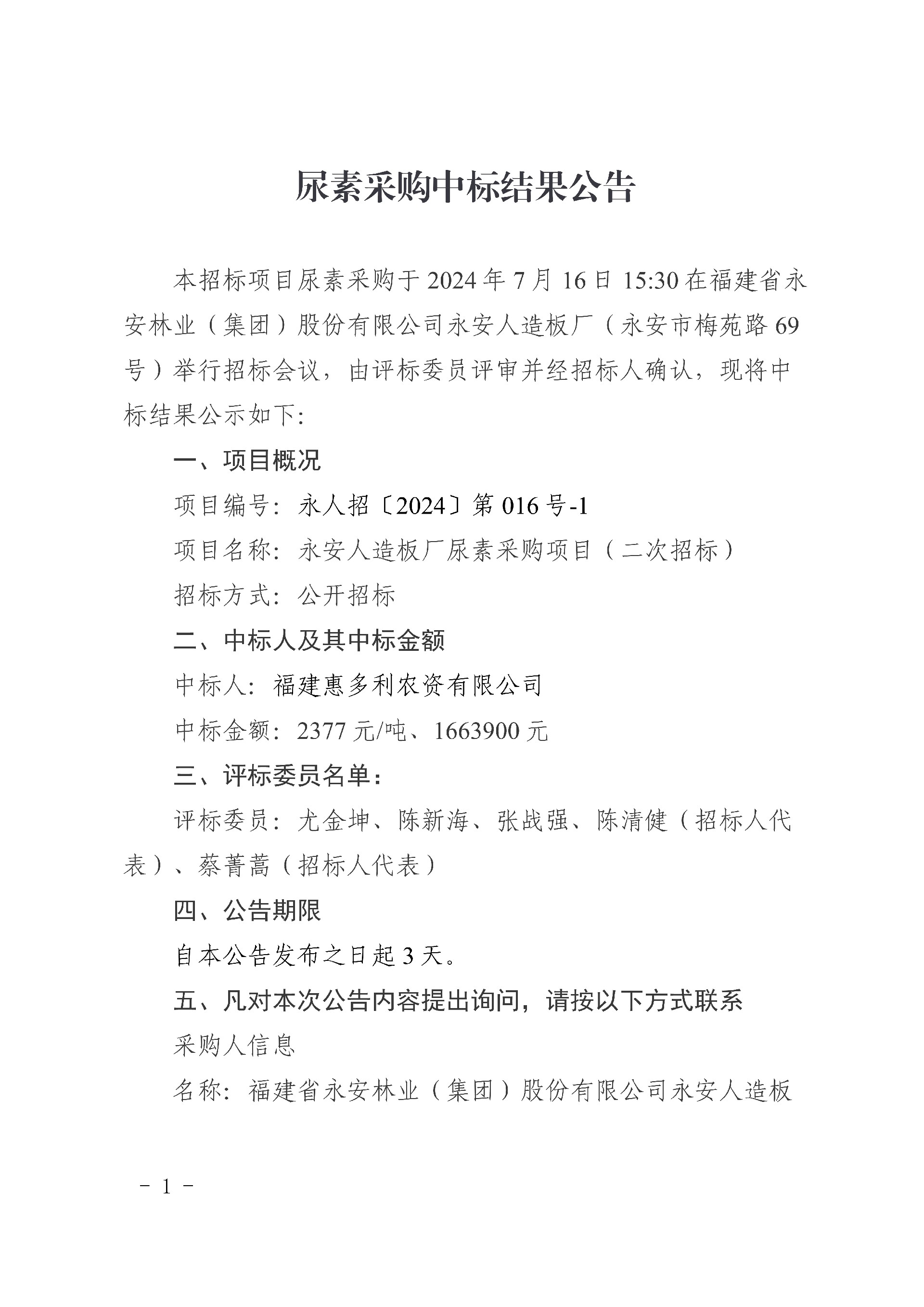 永安人造板廠尿素采購中標結果公告