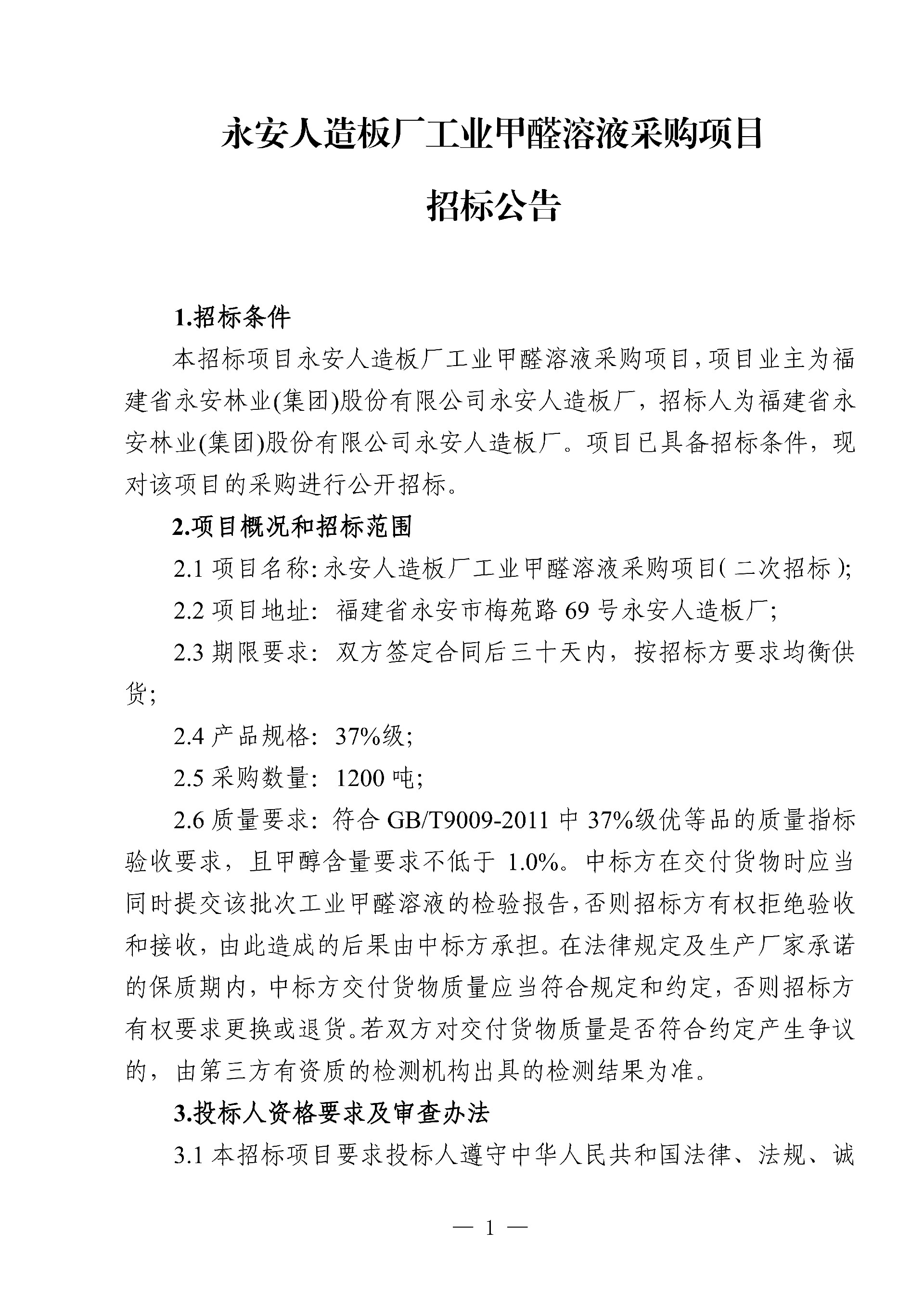 永安人造板廠工業(yè)甲醛溶液采購項(xiàng)目招標(biāo)公告