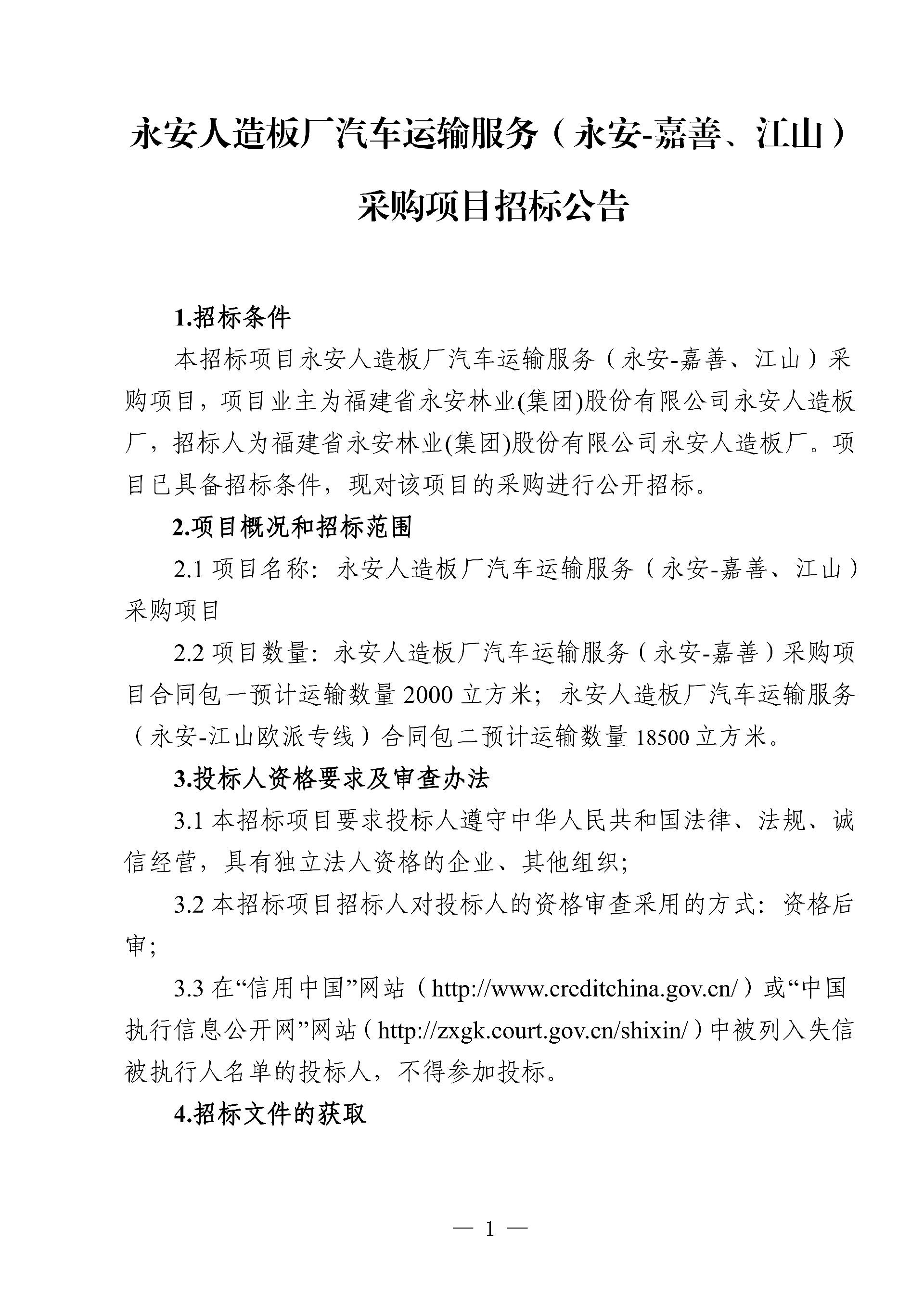 永安人造板廠汽車運(yùn)輸服務(wù)(永安-嘉善、江山)采購項(xiàng)目招標(biāo)公告