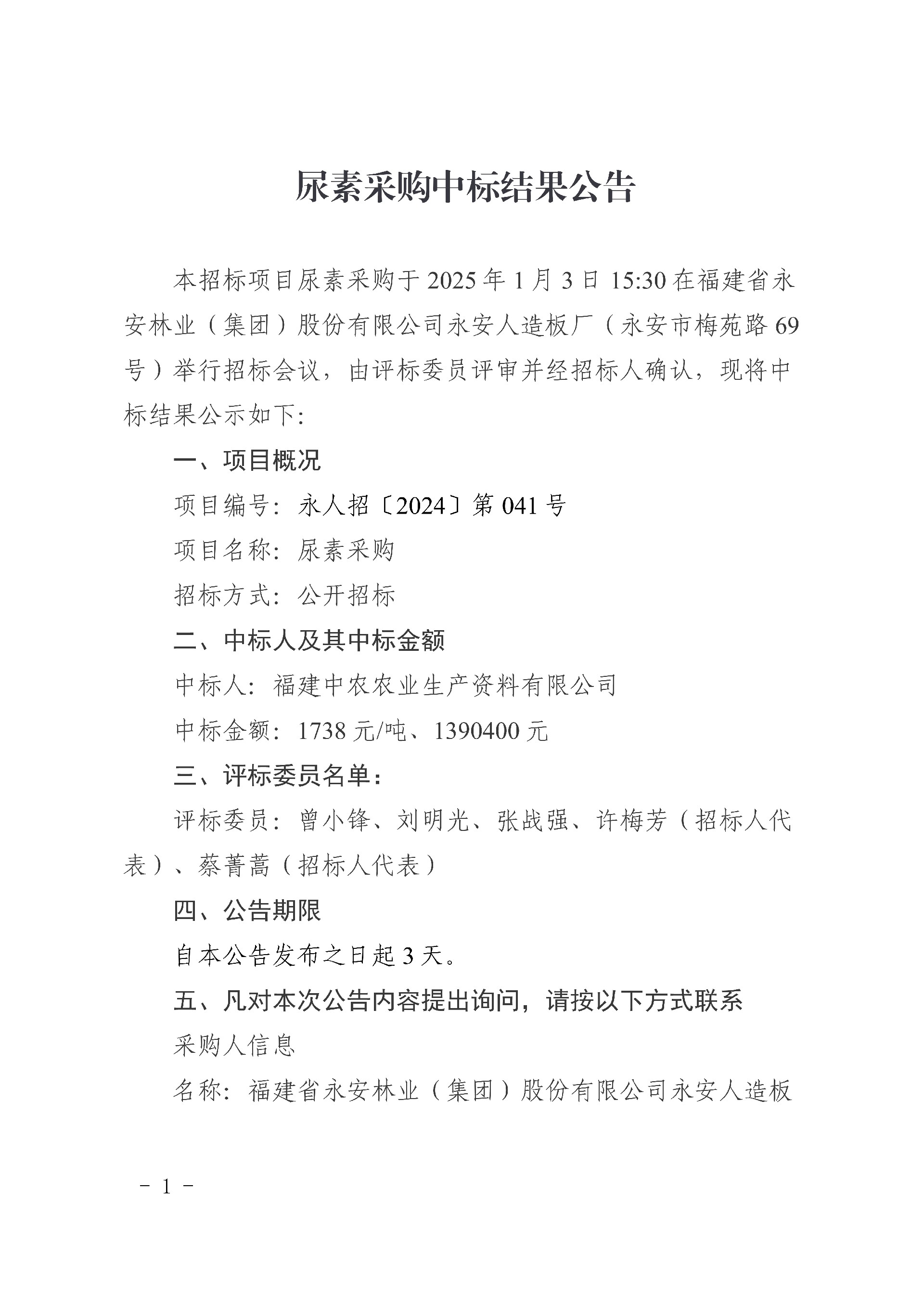 永安人造板廠尿素采購中標(biāo)結(jié)果公告