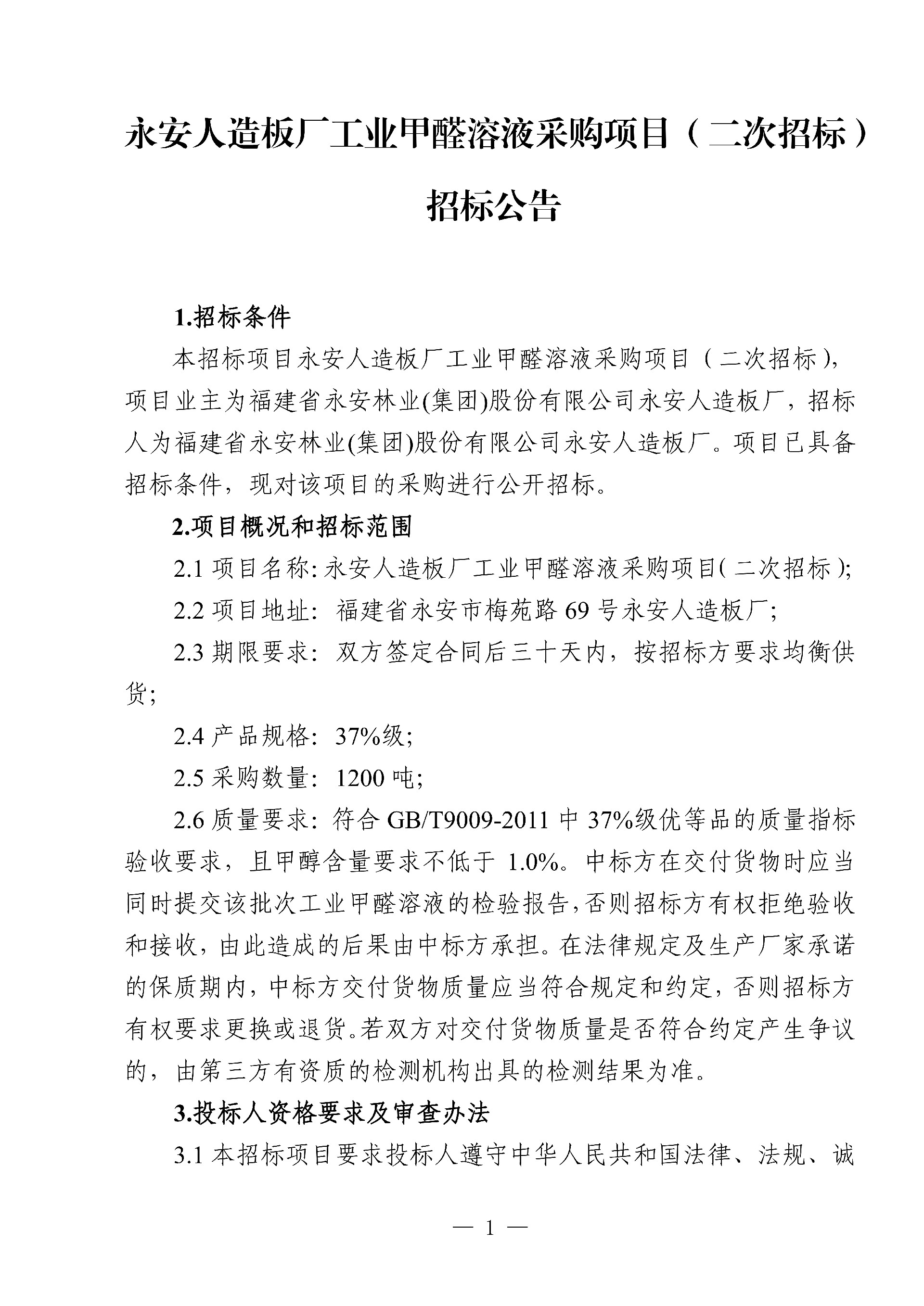 永安人造板廠工業(yè)甲醛溶液采購項目招標公告