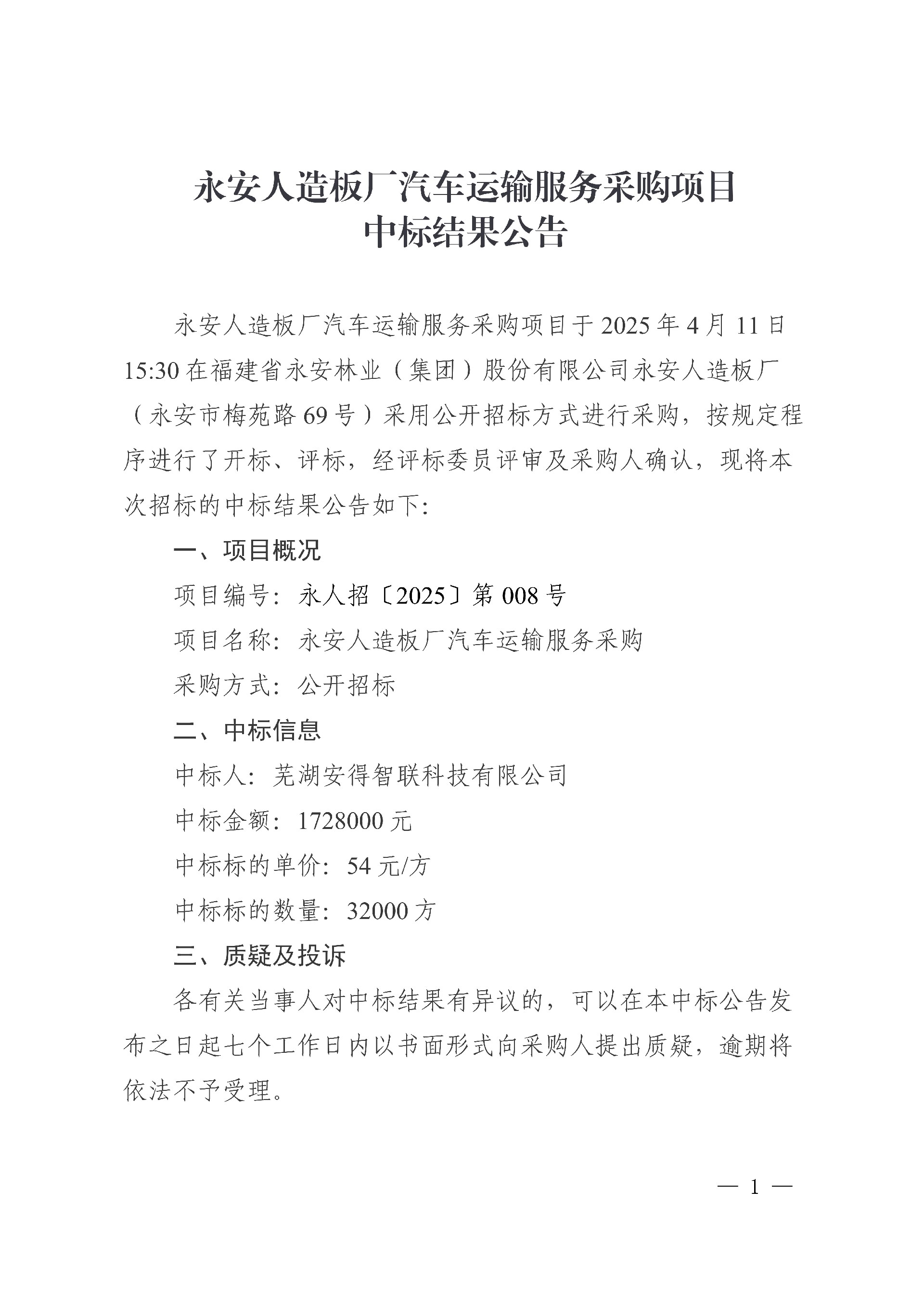 永安人造板廠汽車運(yùn)輸服務(wù)采購項(xiàng)目中標(biāo)結(jié)果公告