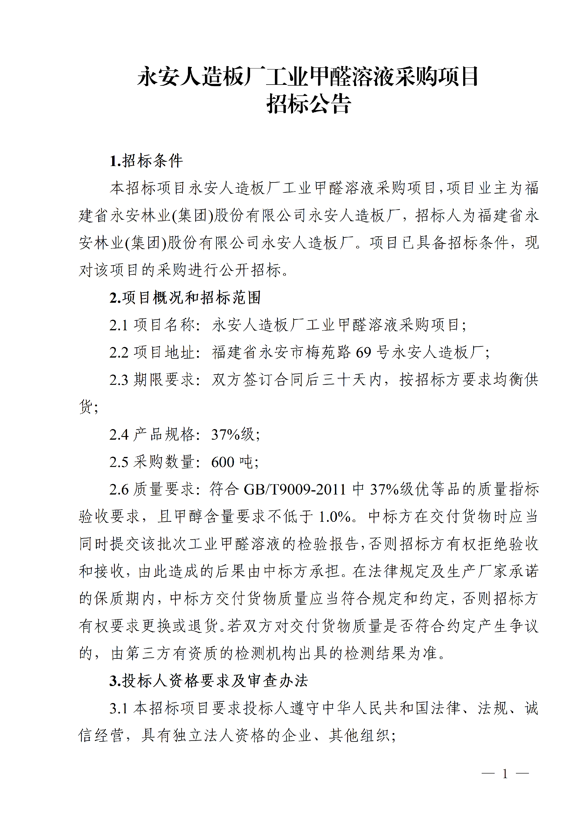 永安人造板廠工業(yè)甲醛溶液采購項(xiàng)目招標(biāo)公告