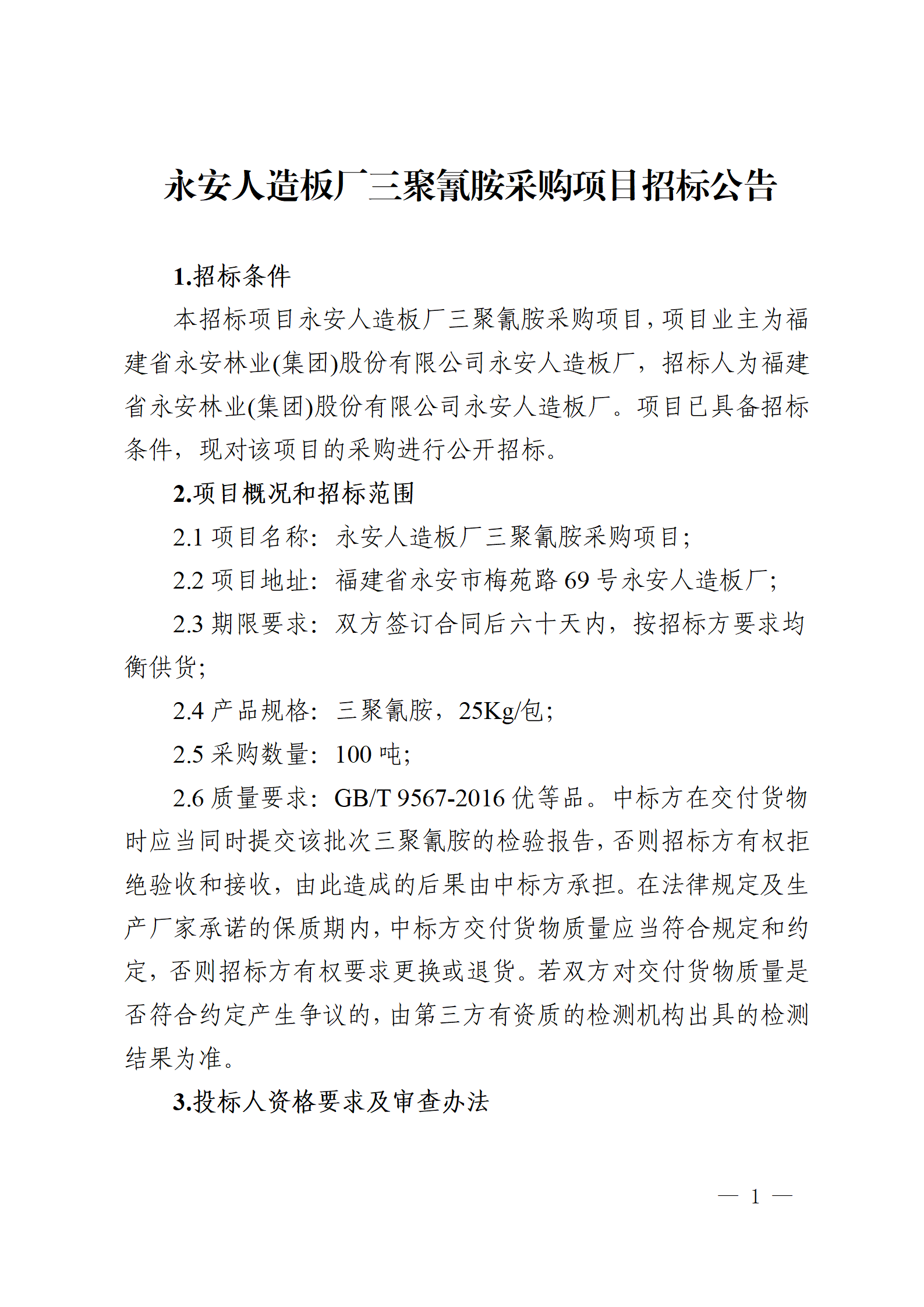 永安人造板廠三聚氰胺采購項目招標(biāo)公告