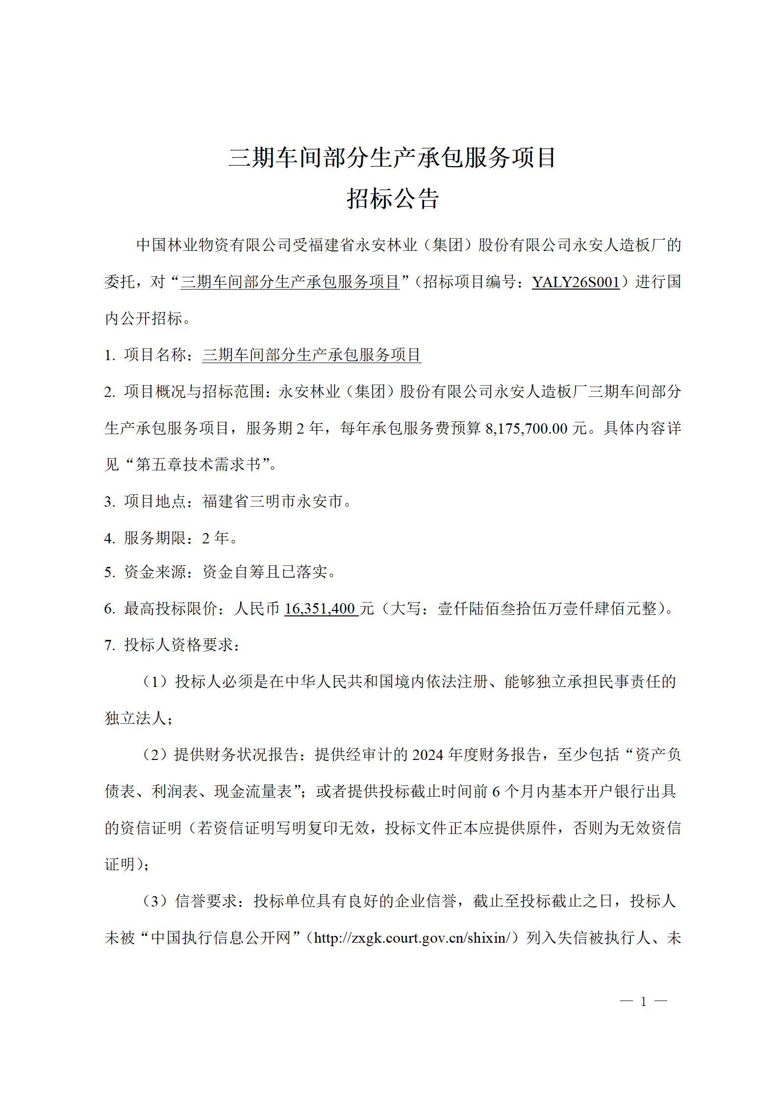 永安人造板廠三期車間部分生產(chǎn)承包服務(wù)項(xiàng)目招標(biāo)公告