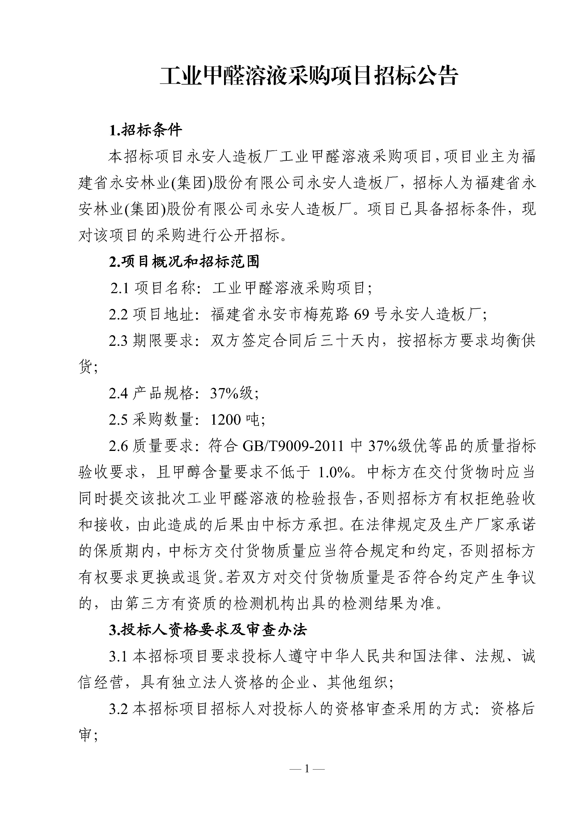 永安人造板廠工業(yè)甲醛溶液采購項(xiàng)目招標(biāo)公告
